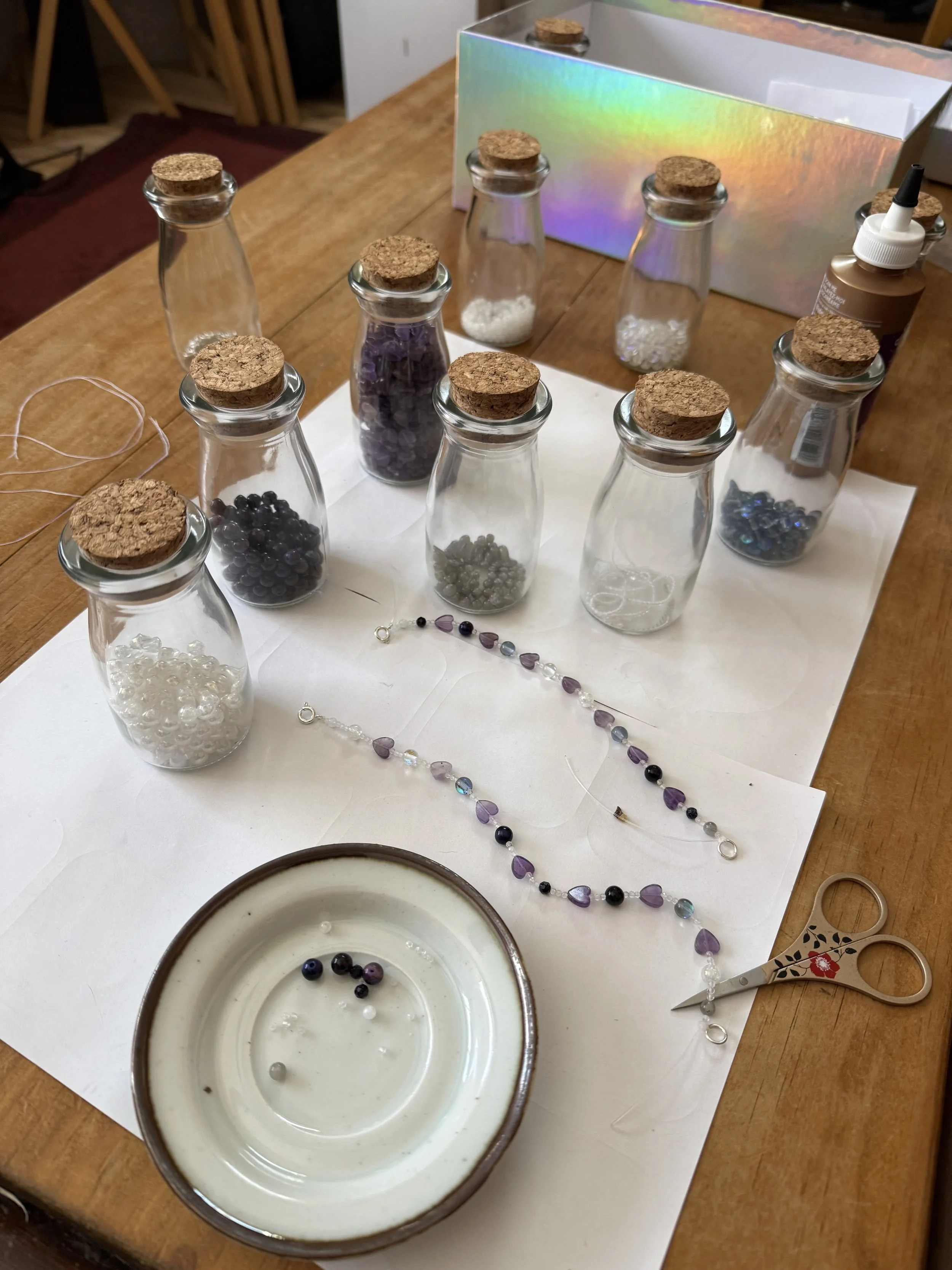 First I picked out the purple amethyst hearts. Every bracelet has at least one. Like with everything, I changed my mind and tried a ton of different combinations, but if you have 7 hearts they are for our Bangtannies, and if you have 1 purple heart it represents you 💜.